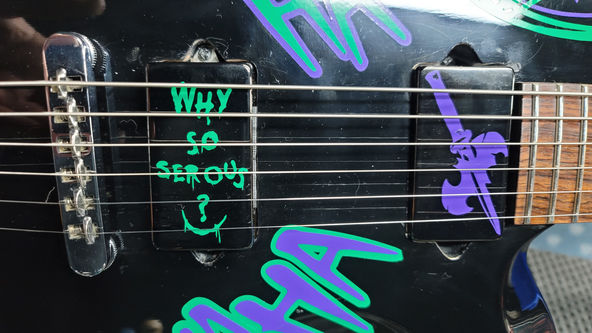 Received this guitar from a family member around Halloween and decided to keep the Halloween spirit alive! Wrapped headstock, and custom cut vinyl with new pots and knobs, and topped it off with blood red pickup rings! fun and simple project that now hangs in my studio!